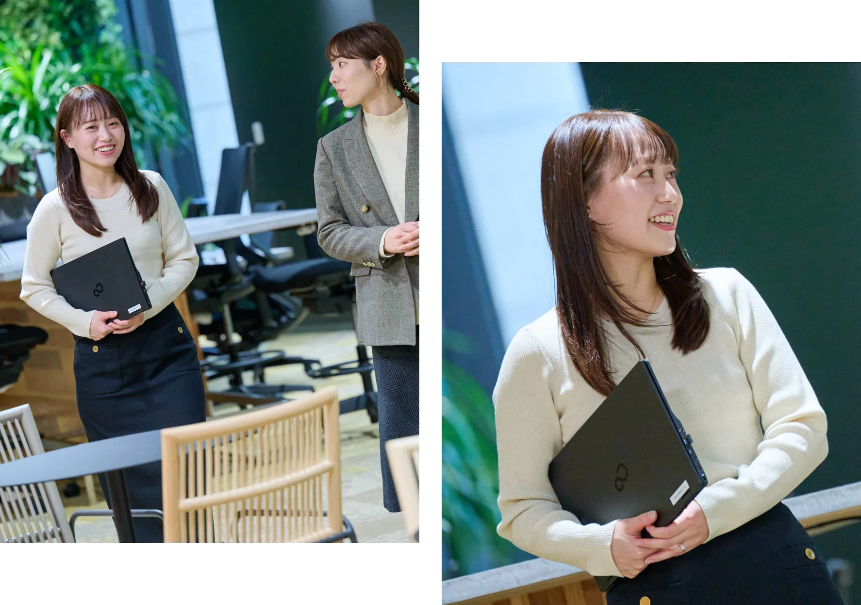 また多様な意見を受け入れてくれる環境も魅力の一つ。改善できそうな業務を見つけた際にすぐに相談ができ、それに対して「やってみよう」と応えてくれる柔軟さがあります。個人の挑戦にしても、業務の改善提案にしても、無責任に任せるのではなく、「私たちもフォローするからひとまずやってみて」という一言を添えてくれるので、いつも大きな安心感の中、新たな一歩を踏み出すことができています。